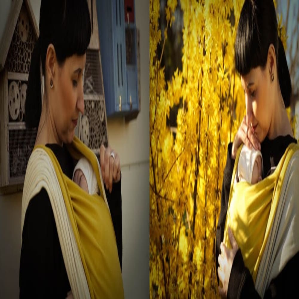 The knitted fabric has a very high-quality feel to it. We have thoroughly tested the wrap and are happy to say: The material does not warp at all and stays in perfect condition. Wonderful! The golden yellow side consists of 100% organic cotton and the natural white side has a small proportion of 10 % silk. The material is easy to manipulate and offers good support. Fantastic. The wrap stretches both lengthwise and crosswise while the width yields comparatively little. This kind of stretch is an important quality as the material should be snug around baby and supportive as well. There are two colours available in the shop currently. We have chosen Harvest. A powerful, golden colour which makes us think of summer. […]”